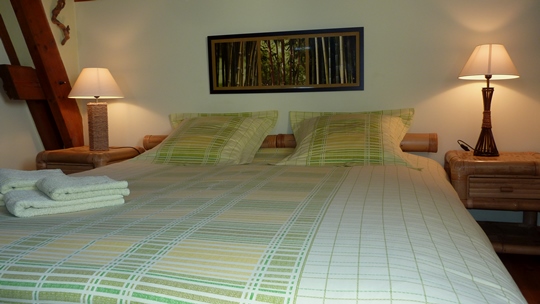 La chambre d'hôtes Bambou est équipée pour trois personnes. Vous y trouverez un grand lit de 1,60 m. Le canapé du coin salon peut être converti en un lit pour une personne. La chambre dispose d'une salle de bain et d'un wc privatifs. Depuis cette chambre, vous bénéficiez d'une vue sur l'ensemble de la vallée et le pic du midi d'Ossau.